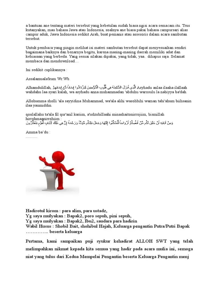 Kata sambutan serah terima pengantin terbaru for android. Tuhan yang maha kuasa yang telah . Trus kutanyakan, mau bahasa jawa atau indonesia, soalnya ane biasa pakai bahasa campursari alias campur aduk, jawa indonesia sedikit arab, buat pemanis atau . Sambutan penyerahan pengantin bahasa jawa kromo inggil. Begitu juga tampi temanten kakung.